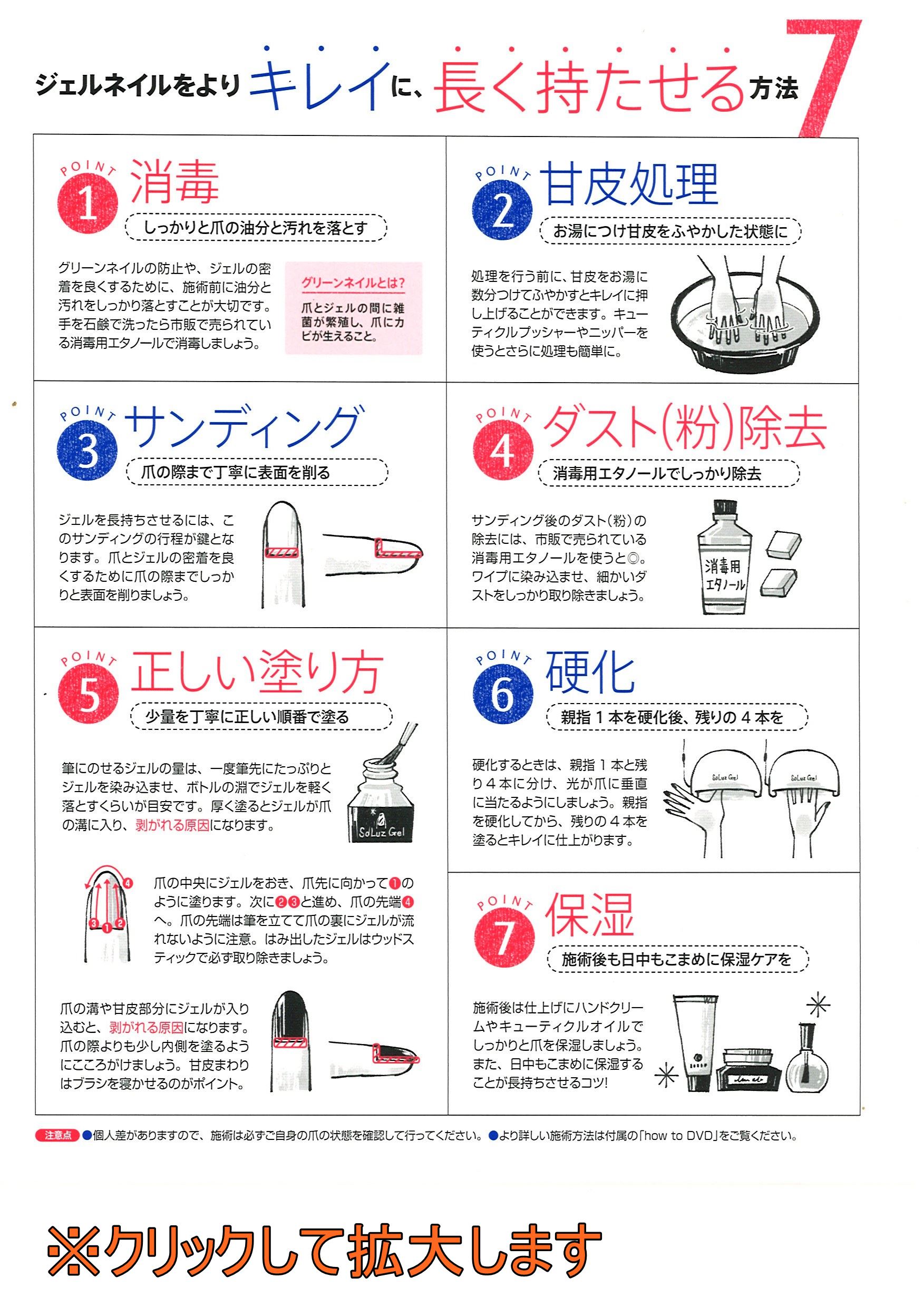 ▼以下は、上記に写真を掲載した、SoLuzGel(ソルースジェル)のキットに同梱されている「ジェルネイルをよりキレイに長く持たせる方法7」に書かれている文章と同じです▼